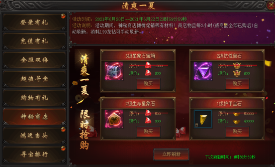活动说明 : 活动期间,神秘商店倾情促销稀有材料!商店物品每2小时自动刷新(或全商品全部已购后),消耗199龙钻可手动刷新。