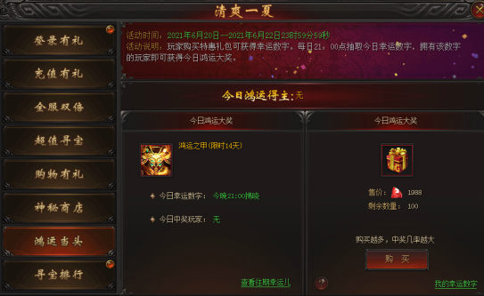活动说明 : 玩家每消耗1988龙钻即可获得一个1-100之间的幸运数字。每日21点抽取今日幸运数字,拥有该数字的玩家即可获得今日鸿运大奖。