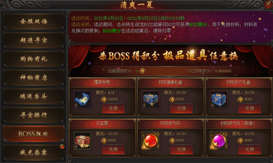 活动说明 : 活动期间内,击杀BOSS获得“boss积分”,“boss积分”可用于兑换材料,每种材料均有兑换次数限制,“boss积分”在活动结束后,清除归零