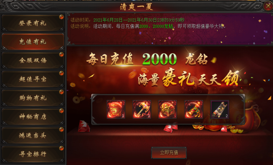活动说明:活动期间,每日充值满2000、20000龙钻!还能领取超值豪华大礼