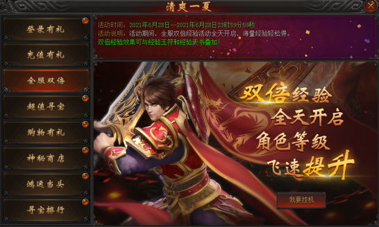 活动说明:活动期间,全服双倍经验活动全天开启,海量经验轻松得。双倍经验效果可与经验玉符和经验天书叠加!