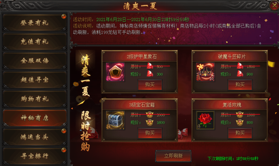 活动说明 : 活动期间,神秘商店倾情促销稀有材料!商店物品每2小时自动刷新(或全商品全部已购后),消耗199龙钻可手动刷新。
