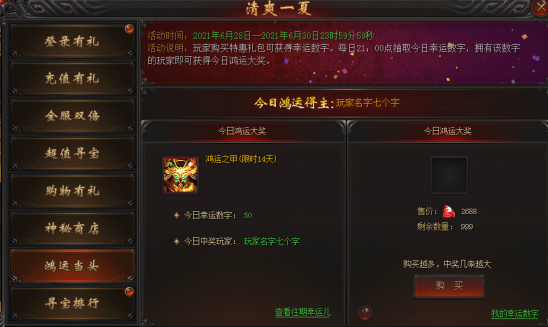 活动说明 : 玩家每消耗1988龙钻即可获得一个1-100之间的幸运数字。每日21点抽取今日幸运数字,拥有该数字的玩家即可获得今日鸿运大奖。