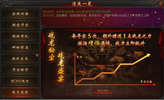 活动说明:活动期间,在战龙秘宝中,每寻宝5次,可额外获得1点战龙之力,获取无上限!