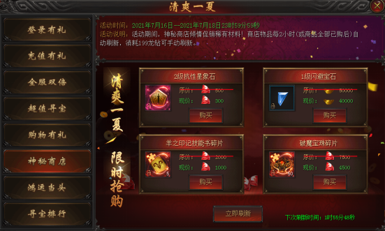活动说明 : 活动期间,神秘商店倾情促销稀有材料!商店物品每2小时自动刷新(或全商品全部已购后),消耗199龙钻可手动刷新。
