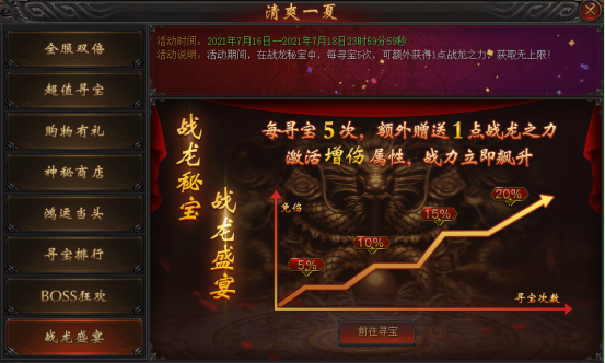活动说明:活动期间,在战龙秘宝中,每寻宝5次,可额外获得1点战龙之力,获取无上限!