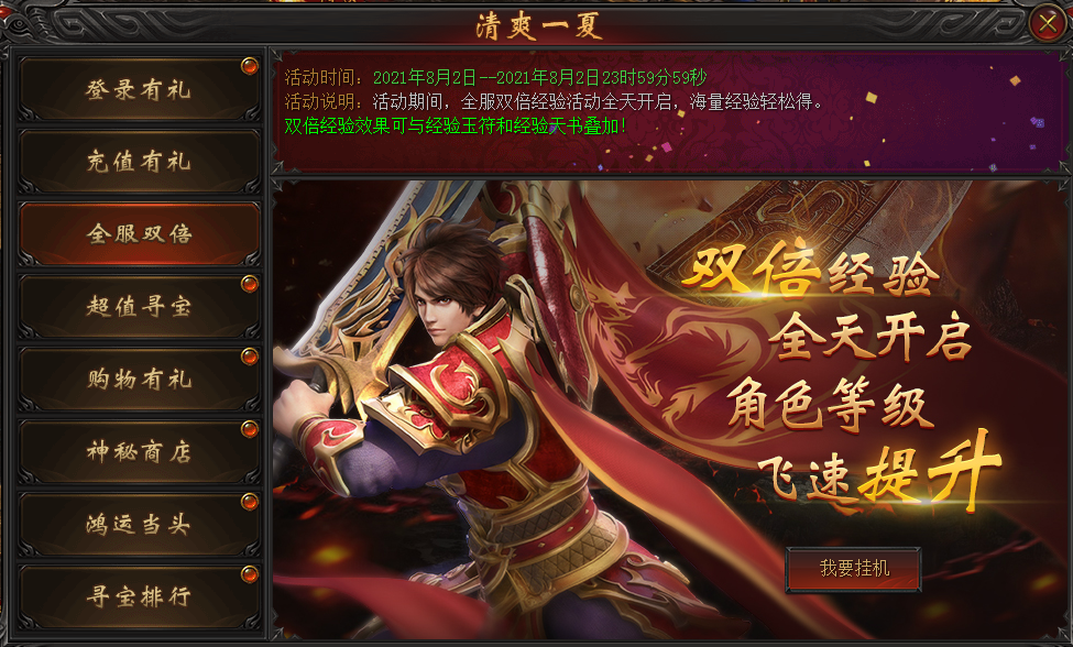活动说明:活动期间,全服双倍经验活动全天开启,海量经验轻松得。双倍经验效果可与经验玉符和经验天书叠加!