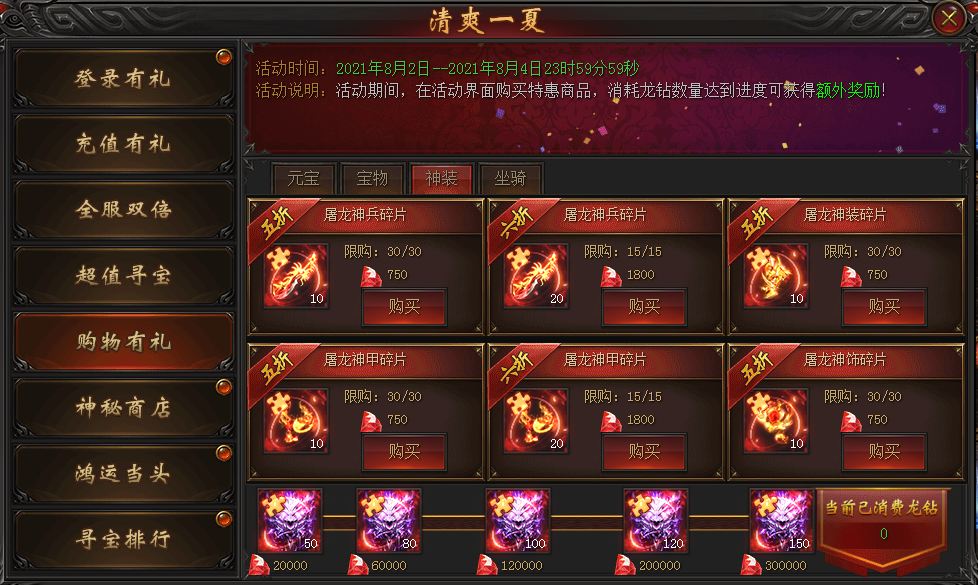活动说明:活动期间,在活动界面购买特惠商品,消耗龙钻数量达到进度可获得额外奖励!