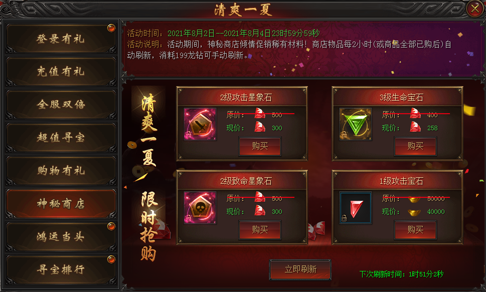 活动说明 : 活动期间,神秘商店倾情促销稀有材料!商店物品每2小时自动刷新(或全商品全部已购后),消耗199龙钻可手动刷新。