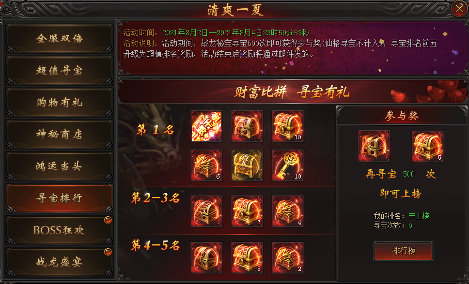 活动说明:活动期间,战龙秘宝寻宝500次即可获得参与奖,寻宝排名前五升级为超值排名奖励,活动结束后奖励将通过邮件发放。