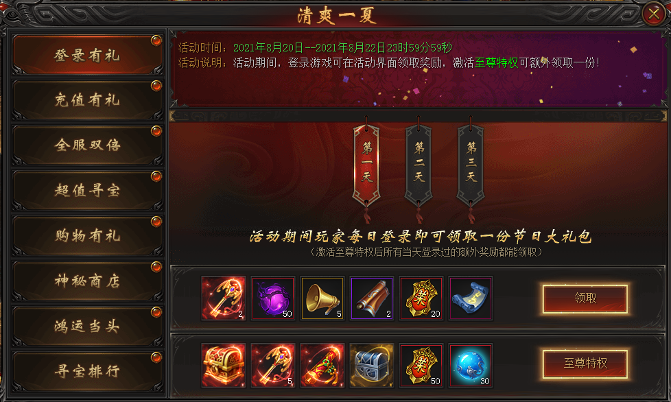 活动说明:活动期间,每日登录游戏可领取奖励,激活至尊特权可额外领取一份!
