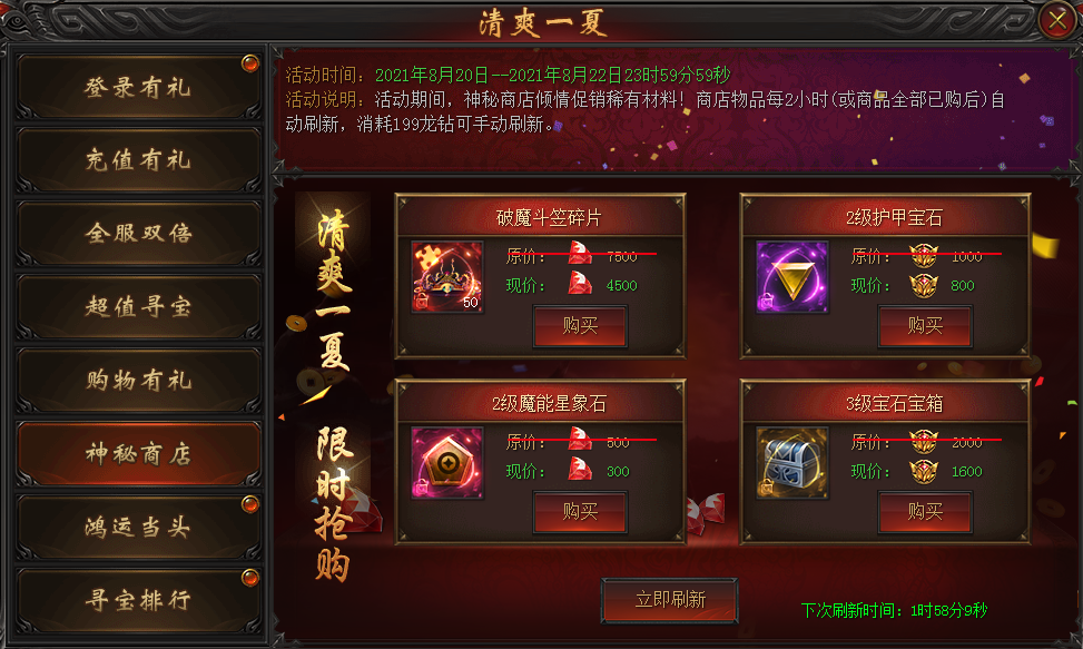 活动说明 : 活动期间,神秘商店倾情促销稀有材料!商店物品每2小时自动刷新(或全商品全部已购后),消耗199龙钻可手动刷新。