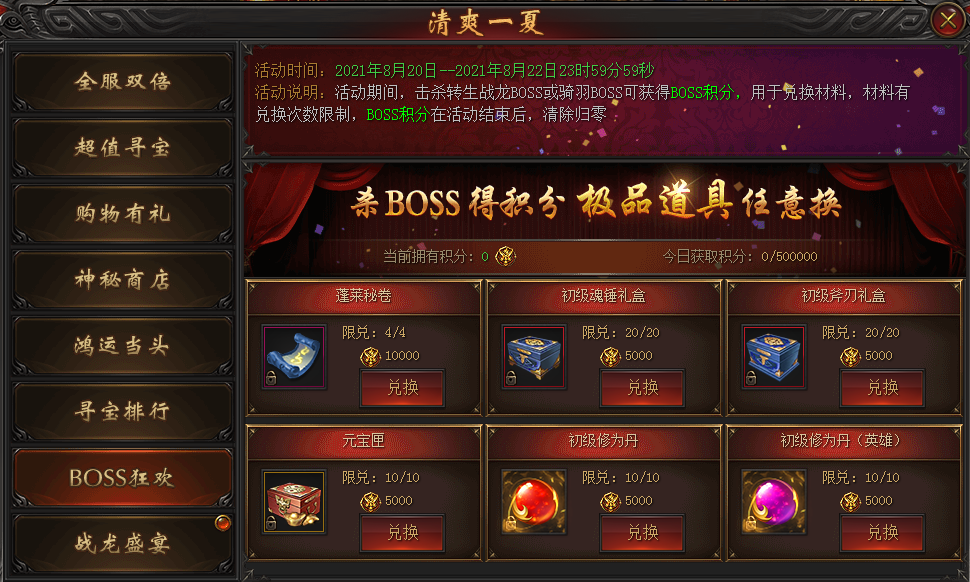 活动说明 : 活动期间内,击杀BOSS获得“boss积分”,“boss积分”可用于兑换材料,每种材料均有兑换次数限制,“boss积分”在活动结束后,清除归零