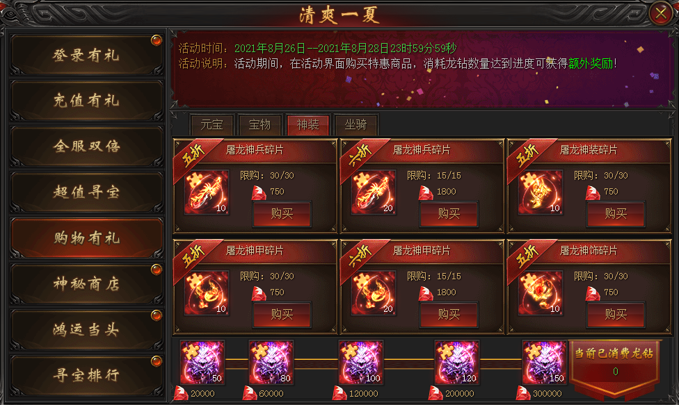 活动说明:活动期间,在活动界面购买特惠商品,消耗龙钻数量达到进度可获得额外奖励!