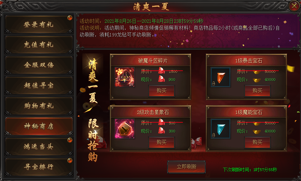 活动说明 : 活动期间,神秘商店倾情促销稀有材料!商店物品每2小时自动刷新(或全商品全部已购后),消耗199龙钻可手动刷新。
