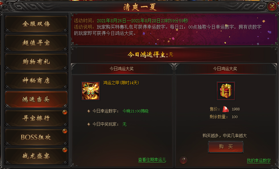活动说明 : 玩家每消耗1988龙钻即可获得一个1-100之间的幸运数字。每日21点抽取今日幸运数字,拥有该数字的玩家即可获得今日鸿运大奖。