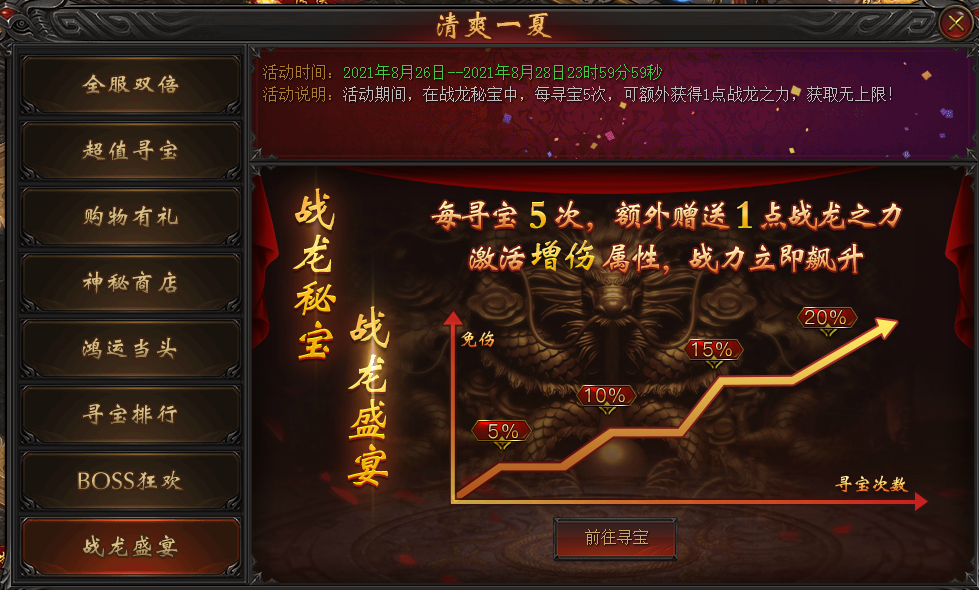 活动说明:活动期间,在战龙秘宝中,每寻宝5次,可额外获得1点战龙之力,获取无上限!