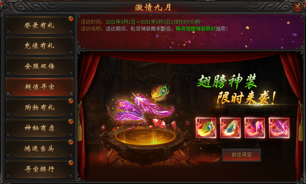 活动说明:活动期间,轮回神装概率翻倍,翅膀神装限时抽取!