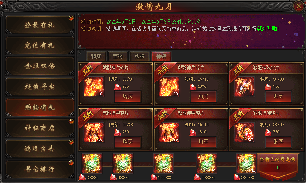 活动说明:活动期间,在活动界面购买特惠商品,消耗龙钻数量达到进度可获得额外奖励!