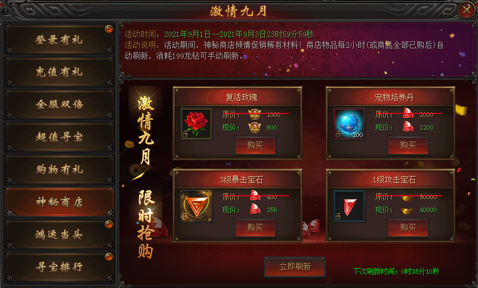 活动说明:活动期间,神秘商店倾情促销稀有材料!商店物品每2小时自动刷新(或全商品全部已购后),消耗199龙钻可手动刷新。