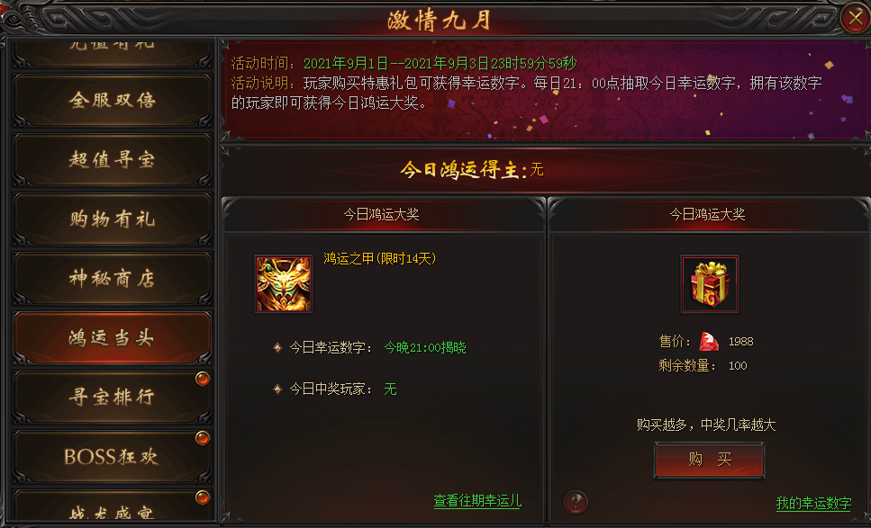 活动说明:玩家每消耗1988龙钻即可获得一个1-100之间的幸运数字。每日21点抽取今日幸运数字,拥有该数字的玩家即可获得今日鸿运大奖。