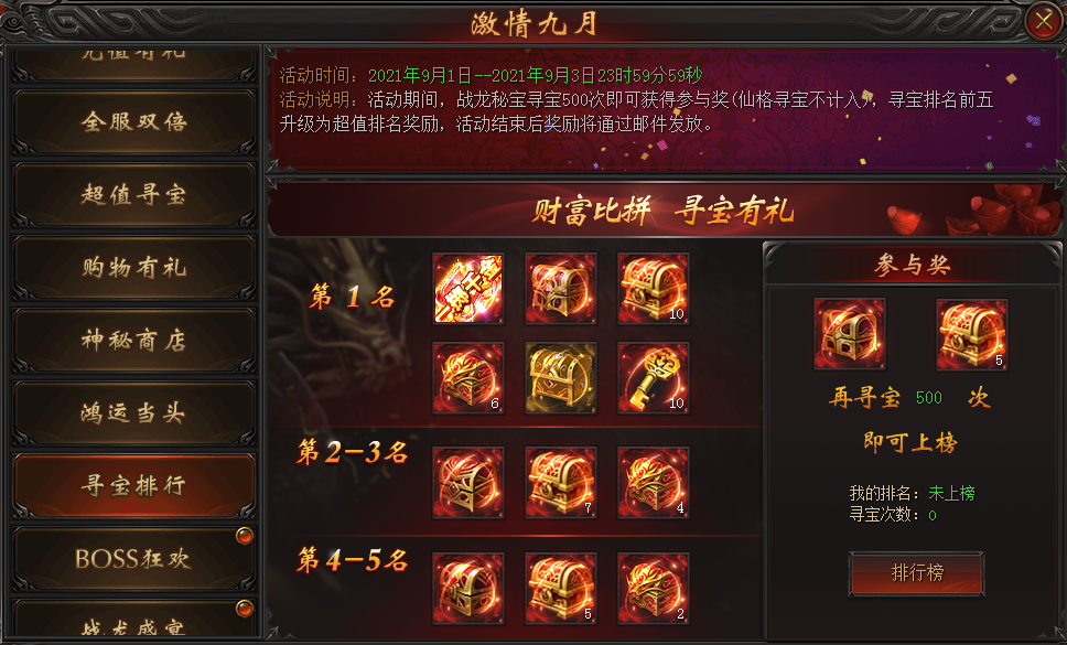 活动说明:活动期间,战龙秘宝寻宝500次即可获得参与奖,寻宝排名前五升级为超值排名奖励,活动结束后奖励将通过邮件发放。