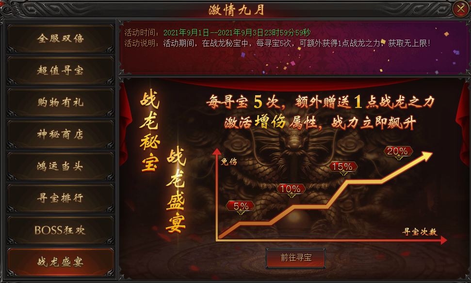 活动说明:活动期间,在战龙秘宝中,每寻宝5次,可额外获得1点战龙之力,获取无上限!