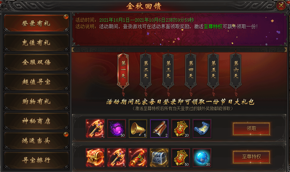 活动说明:活动期间,每日登录游戏可领取奖励,激活至尊特权可额外领取一份!