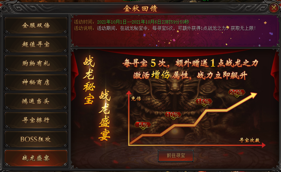 活动说明:活动期间,在战龙秘宝中,每寻宝5次,可额外获得1点战龙之力,获取无上限!