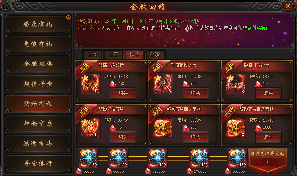 活动说明:活动期间,在活动界面购买特惠商品,消耗龙钻数量达到进度可获得额外奖励!