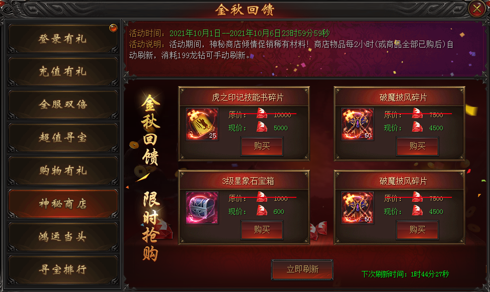 活动说明:活动期间,神秘商店倾情促销稀有材料!商店物品每2小时自动刷新(或全商品全部已购后),消耗199龙钻可手动刷新。