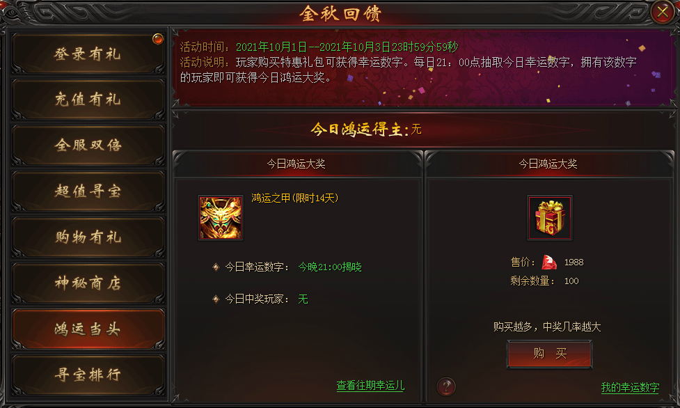 活动说明:玩家每消耗1988龙钻即可获得一个1-100之间的幸运数字。每日21点抽取今日幸运数字,拥有该数字的玩家即可获得今日鸿运大奖。