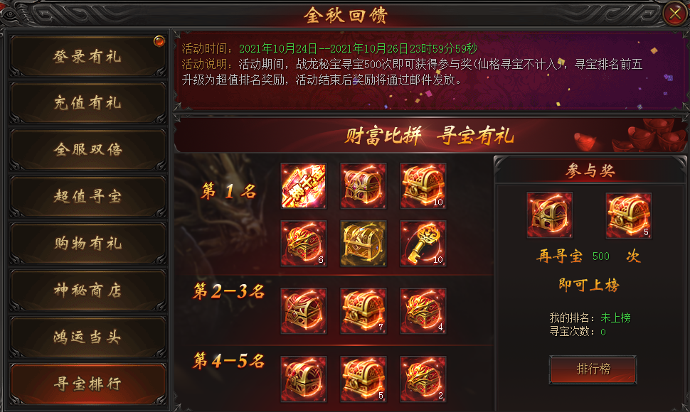 活动说明:活动期间,战龙秘宝寻宝500次即可获得参与奖,寻宝排名前五升级为超值排名奖励,活动结束后奖励将通过邮件发放。