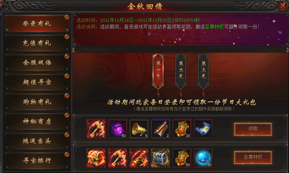 活动说明:活动期间,每日登录游戏可领取奖励,激活至尊特权可额外领取一份!