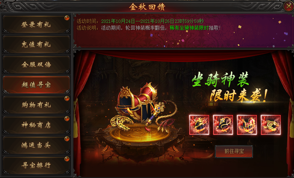 活动说明:活动期间,轮回神装概率翻倍,坐骑神装限时抽取!