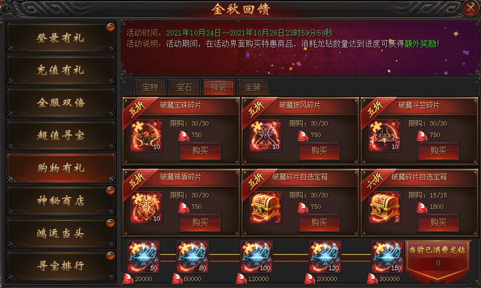 活动说明:活动期间,在活动界面购买特惠商品,消耗龙钻数量达到进度可获得额外奖励!