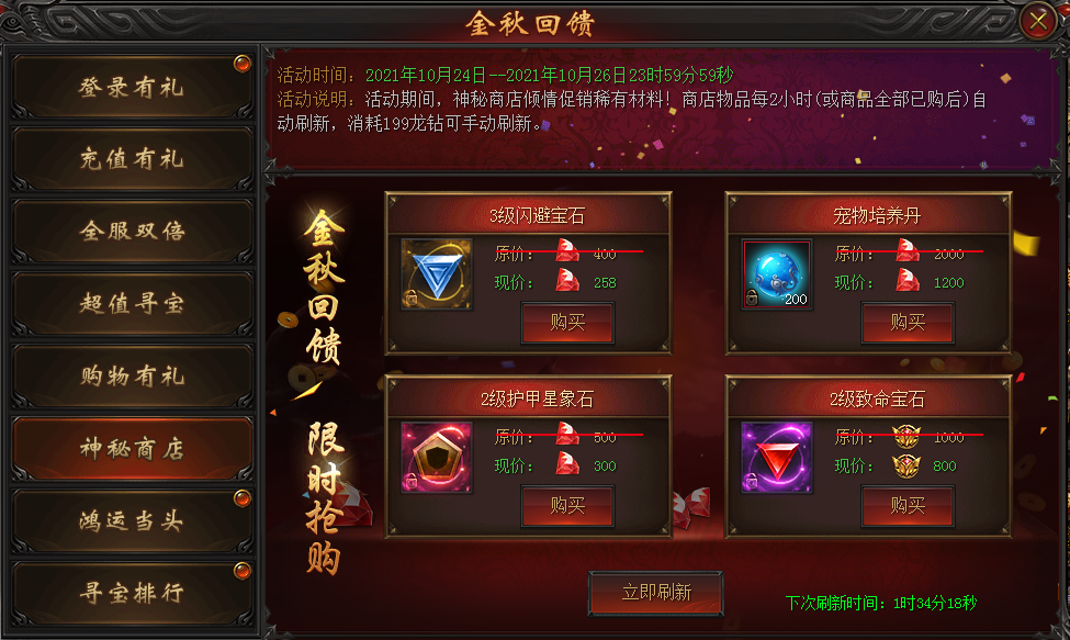 活动说明:活动期间,神秘商店倾情促销稀有材料!商店物品每2小时自动刷新(或全商品全部已购后),消耗199龙钻可手动刷新。