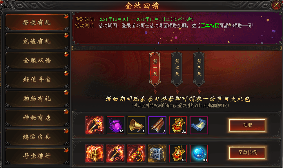 活动说明:活动期间,每日登录游戏可领取奖励,激活至尊特权可额外领取一份!