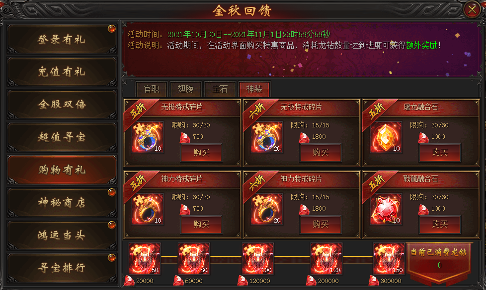 活动说明:活动期间,在活动界面购买特惠商品,消耗龙钻数量达到进度可获得额外奖励!