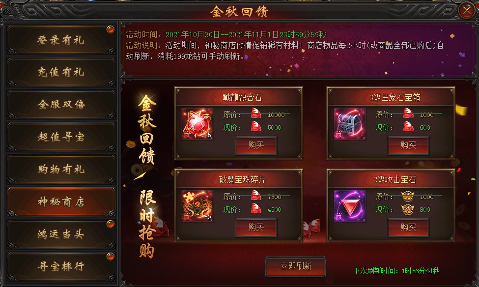 活动说明:活动期间,神秘商店倾情促销稀有材料!商店物品每2小时自动刷新(或全商品全部已购后),消耗199龙钻可手动刷新。