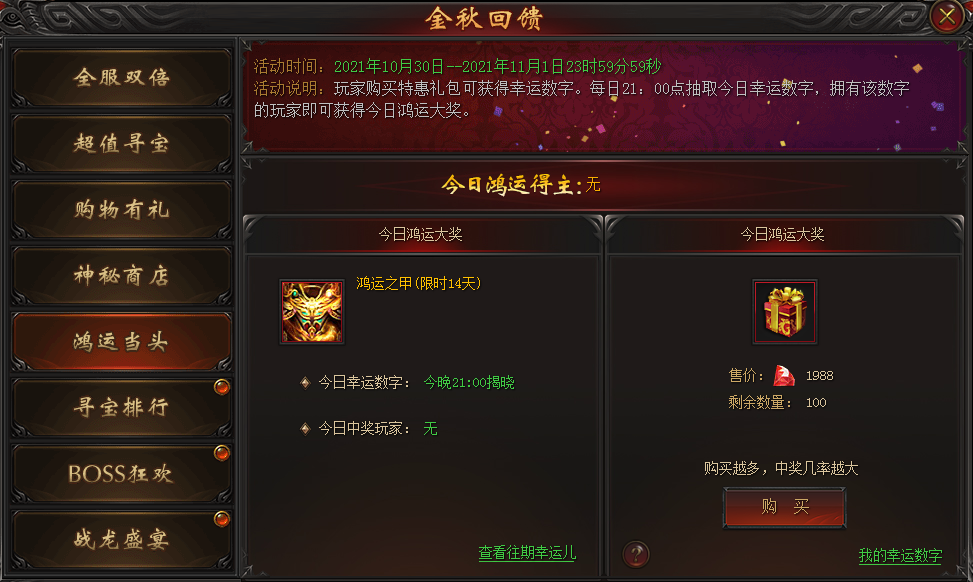 活动说明:玩家每消耗1988龙钻即可获得一个1-100之间的幸运数字。每日21点抽取今日幸运数字,拥有该数字的玩家即可获得今日鸿运大奖。