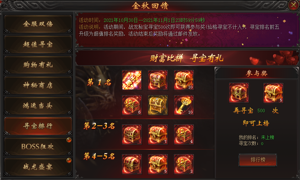 活动说明:活动期间,战龙秘宝寻宝500次即可获得参与奖,寻宝排名前五升级为超值排名奖励,活动结束后奖励将通过邮件发放。
