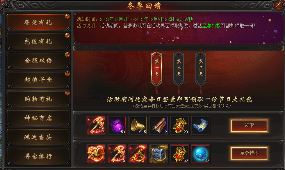 活动说明:活动期间,每日登录游戏可领取奖励,激活至尊特权可额外领取一份!