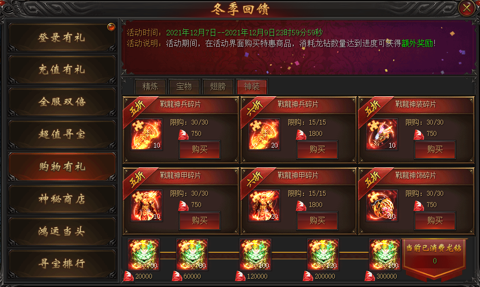 活动说明:活动期间,在活动界面购买特惠商品,消耗龙钻数量达到进度可获得额外奖励!