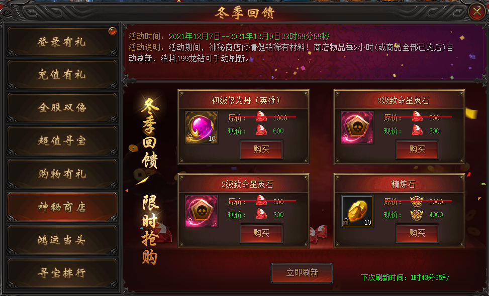 活动说明:活动期间,神秘商店倾情促销稀有材料!商店物品每2小时自动刷新(或全商品全部已购后),消耗199龙钻可手动刷新。