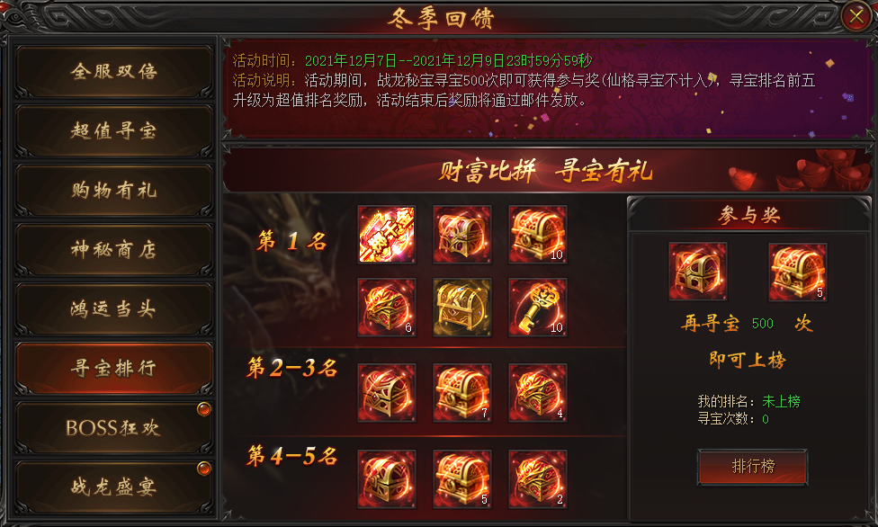 活动说明:活动期间,战龙秘宝寻宝500次即可获得参与奖,寻宝排名前五升级为超值排名奖励,活动结束后奖励将通过邮件发放。