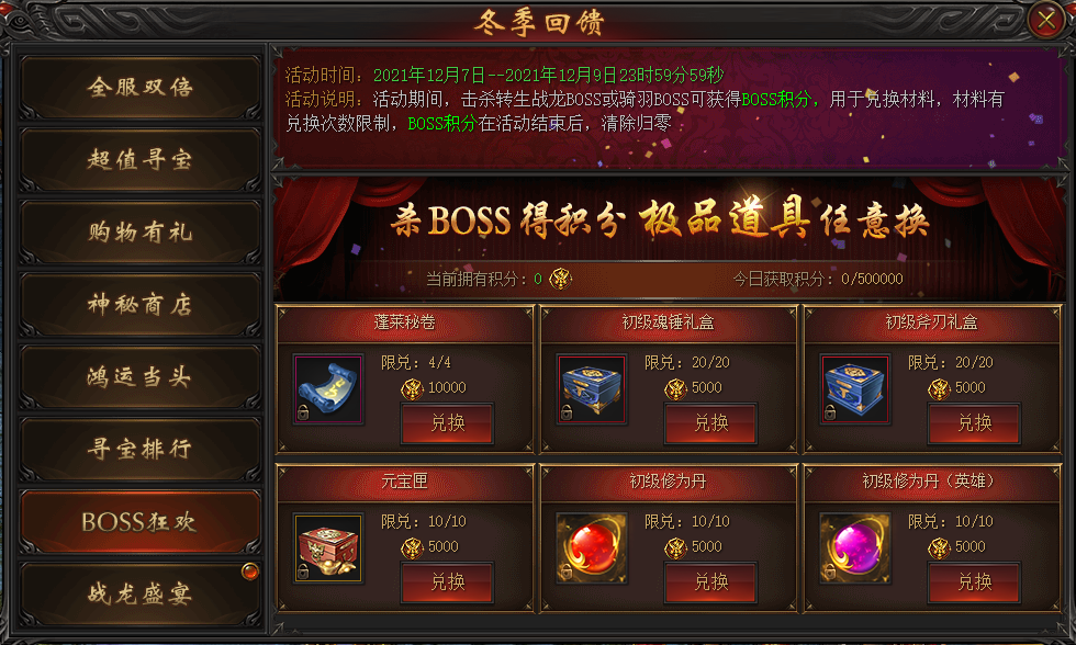 活动说明:活动期间内,击杀BOSS获得“boss积分”,“boss积分”可用于兑换材料,每种材料均有兑换次数限制,“boss积分”在活动结束后,清除归零
