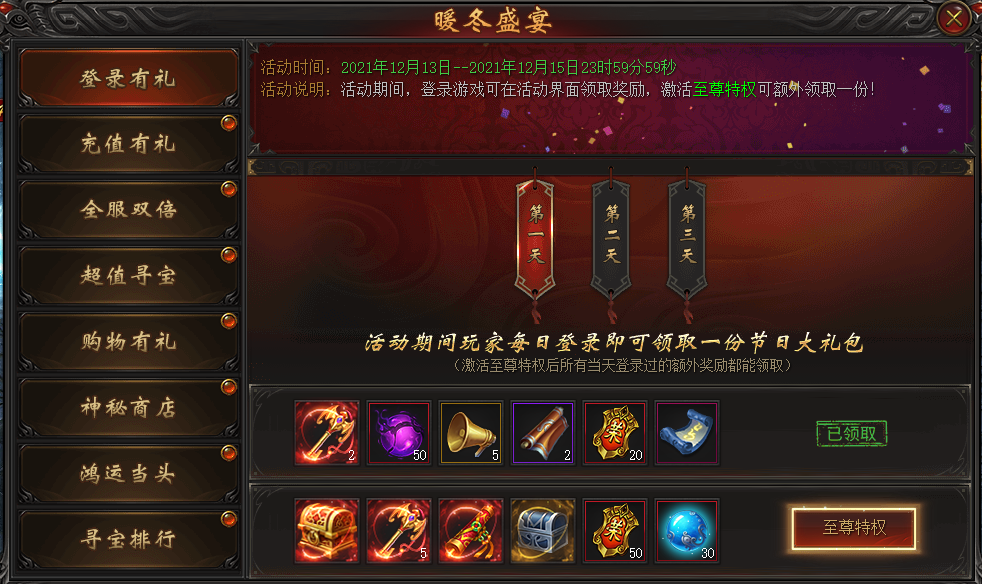 活动说明:活动期间,每日登录游戏可领取奖励,激活至尊特权可额外领取一份!