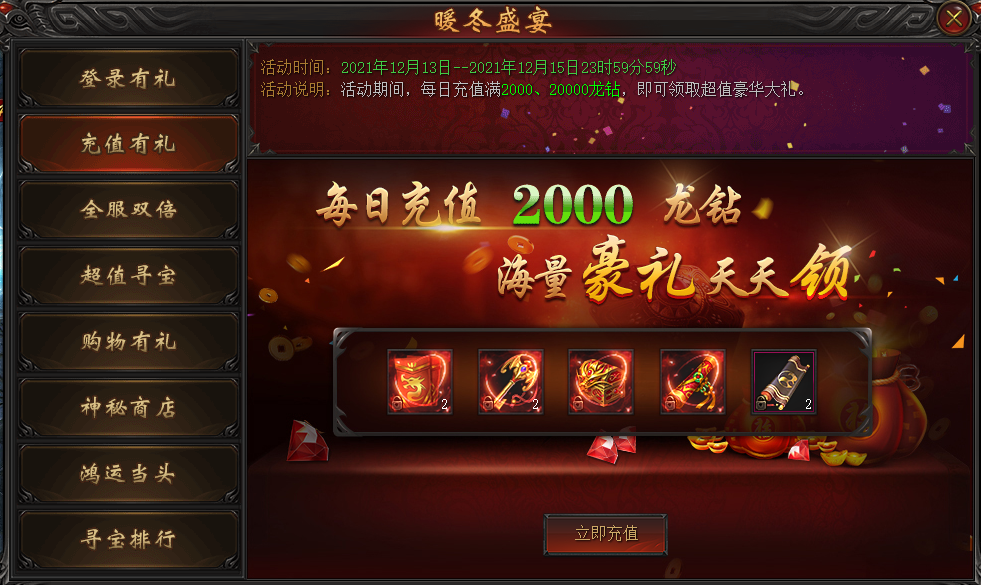活动说明:活动期间,每日充值满2000、20000龙钻!还能领取超值豪华大礼