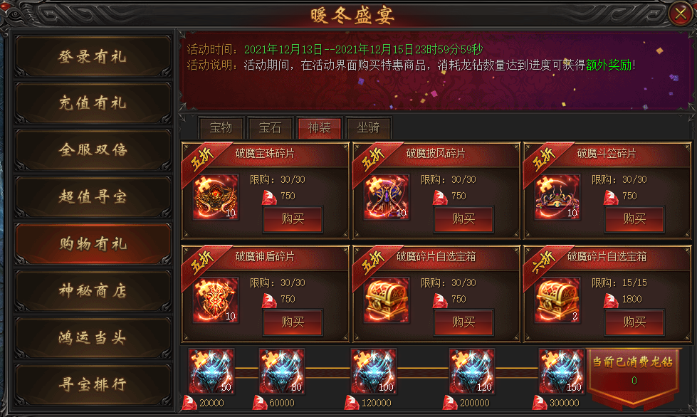 活动说明:活动期间,在活动界面购买特惠商品,消耗龙钻数量达到进度可获得额外奖励!